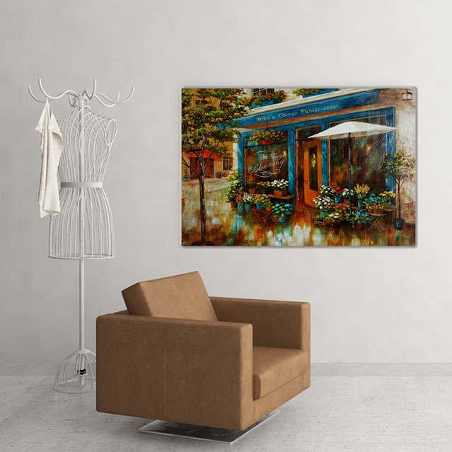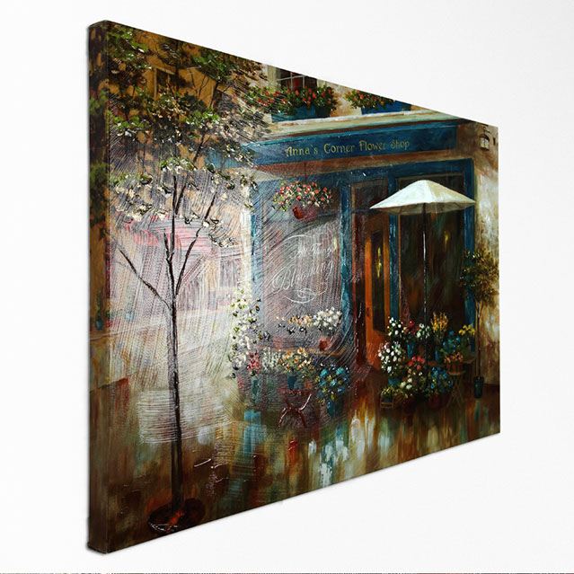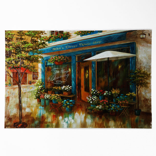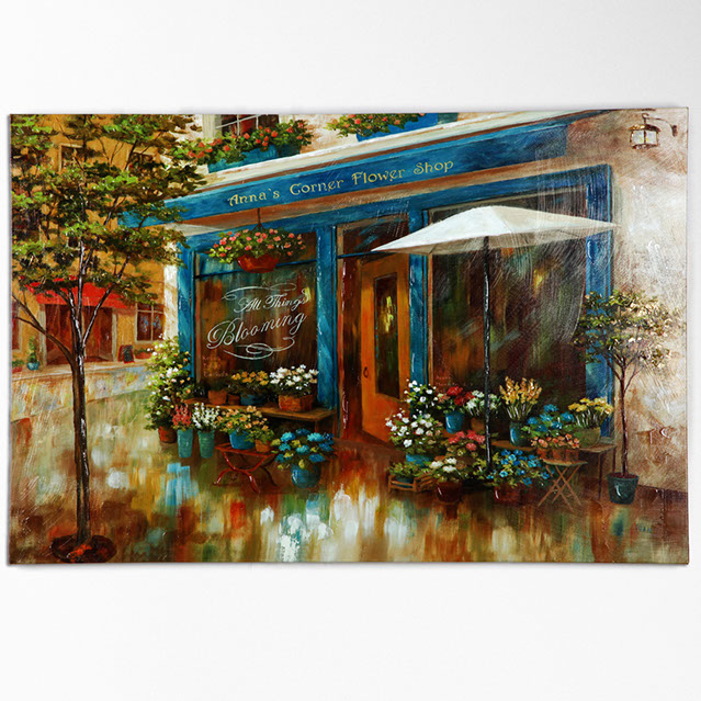 "ANNA'S CORNER FLOWER SHOP" by NAN F is part of our NAN Series of arts. The NAN series features traditional style arts with a warm and cozy feeling. This gallery wrapped hand embellished piece has received a high level of careful hand embellishment .