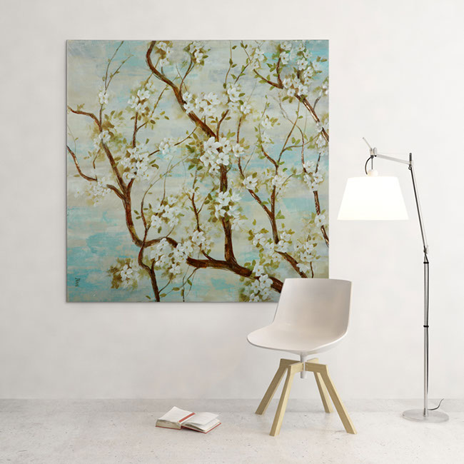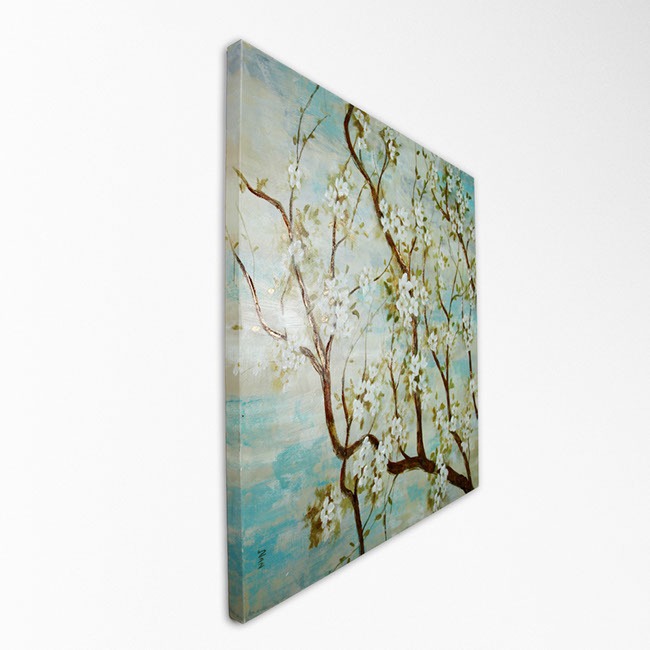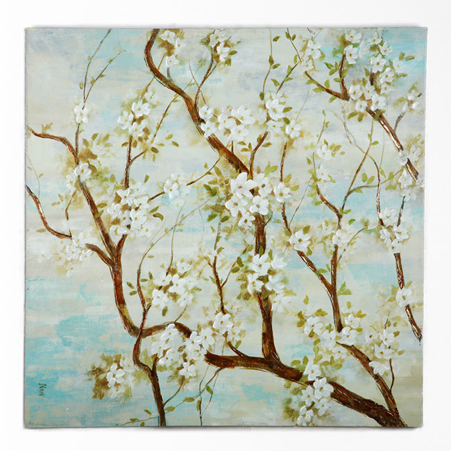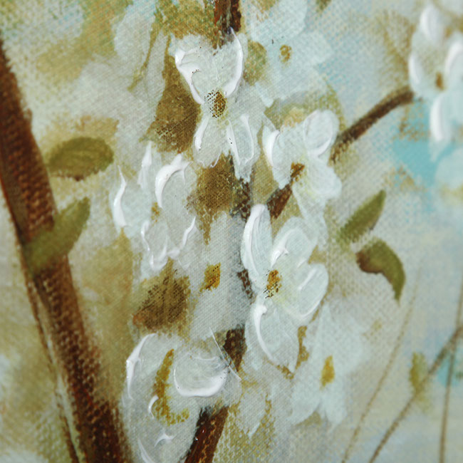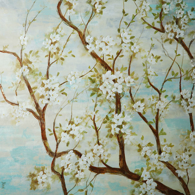 "Spring in Bloom" by NAN F is a part of our OVERSIZED series of arts. Featuring a subtle color pallet this piece will be at home just about anywhere. This gallery wrapped hand embellished piece has received a high level of careful hand embellishment .